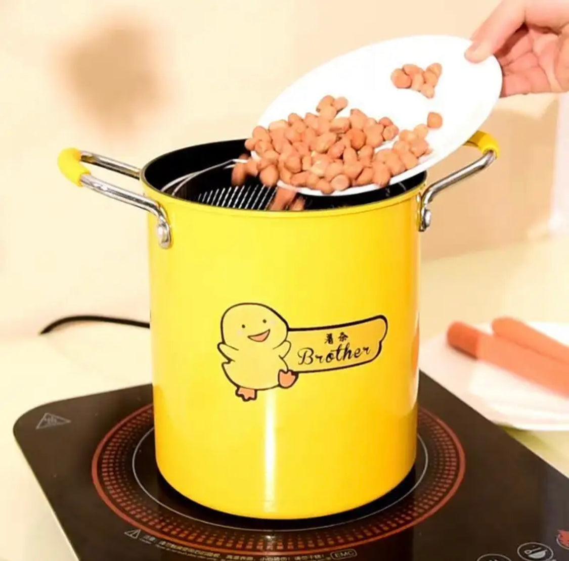 ⭐️ بعد الإنتهاء من التحمير يمكنك الضغط على زراعي الباسكت لرفعه الى أعلى كما في الصورة لتصفية كل الزيت