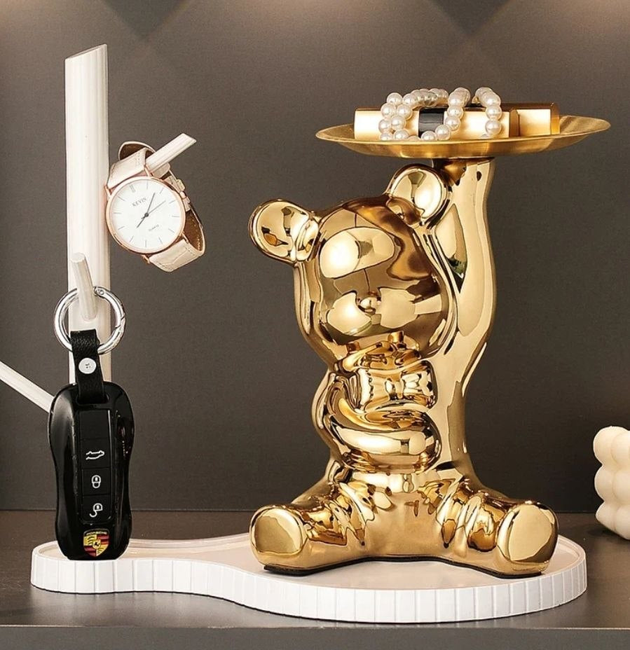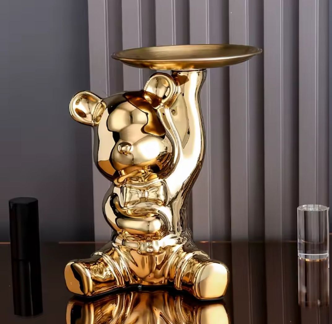 قطعة ديكور مميزة بتصميم دب ذهبي لامع مع صينية عملية — تجمع بين الفخامة والوظيفة في نفس الوقت ✨