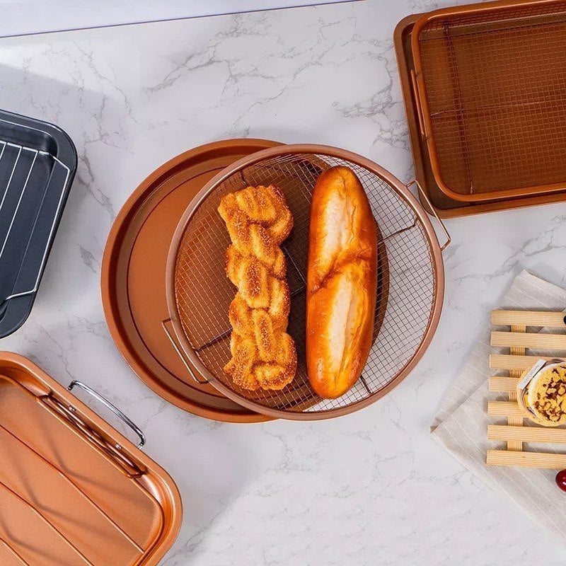 مجموعة التحمير الصحية هتعملى بيها أحلى أكل محمر ومقلى بدون ولا نقطة زيت، المجموعة عبارة عن قطعتين، أول قطعة هى شبكة التحمير المضادة للالتصاق اللى هتحطى فيها كل أكلك وهتديلك أحسن تسوية وأحلى قرمشة بدون ما الاكل يلزق أو يتلسع او يتحرق، ومش هتحتاجى كمان تقلبى الأكل لأن الشبكة بتوزع الحرارة بالتساوى من فوق ومن تحت كمان وهتضمنلك تسوية ممتازة من الجنبين مع بعض